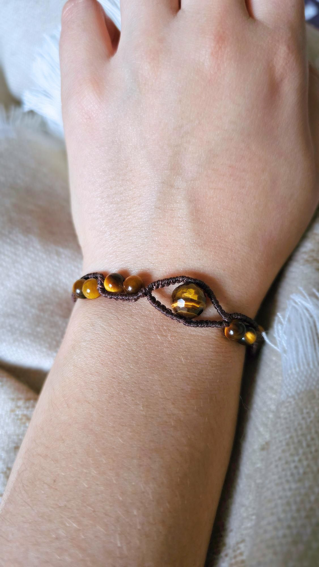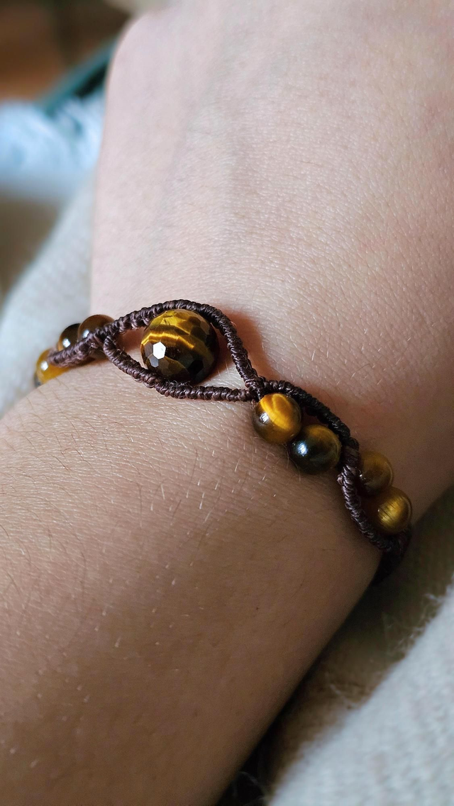 Au centre, une superbe en œil de tigre facettée forme, avec le tissage en macramé, un motif qui évoque un œil protecteur. Les perles qui l’accompagnent sont d’une grande qualité, lumineuses et traversées de reflets dorés naturels.