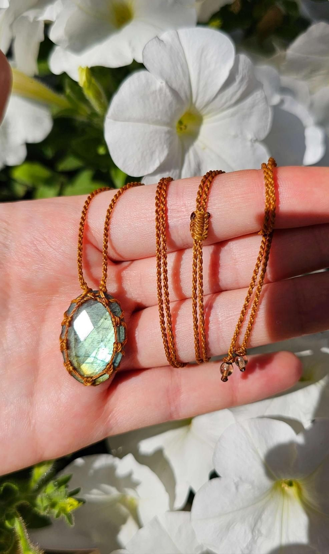 Collier unique tissé à la main avec un fil solide et résistant à l'eau. Il met en avant une très jolie labradorite double-face.