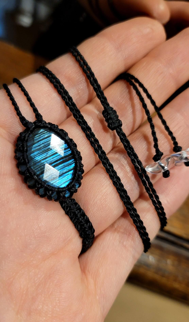 Pièce unique tissé à la main avec un fil solide et résistant à l'eau. Il met en avant une très jolie labradorite double-face.