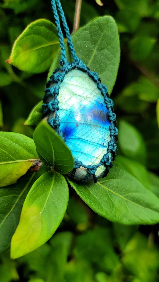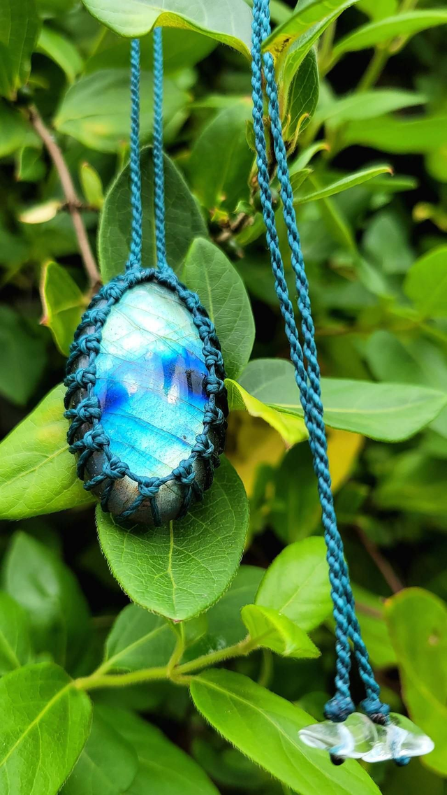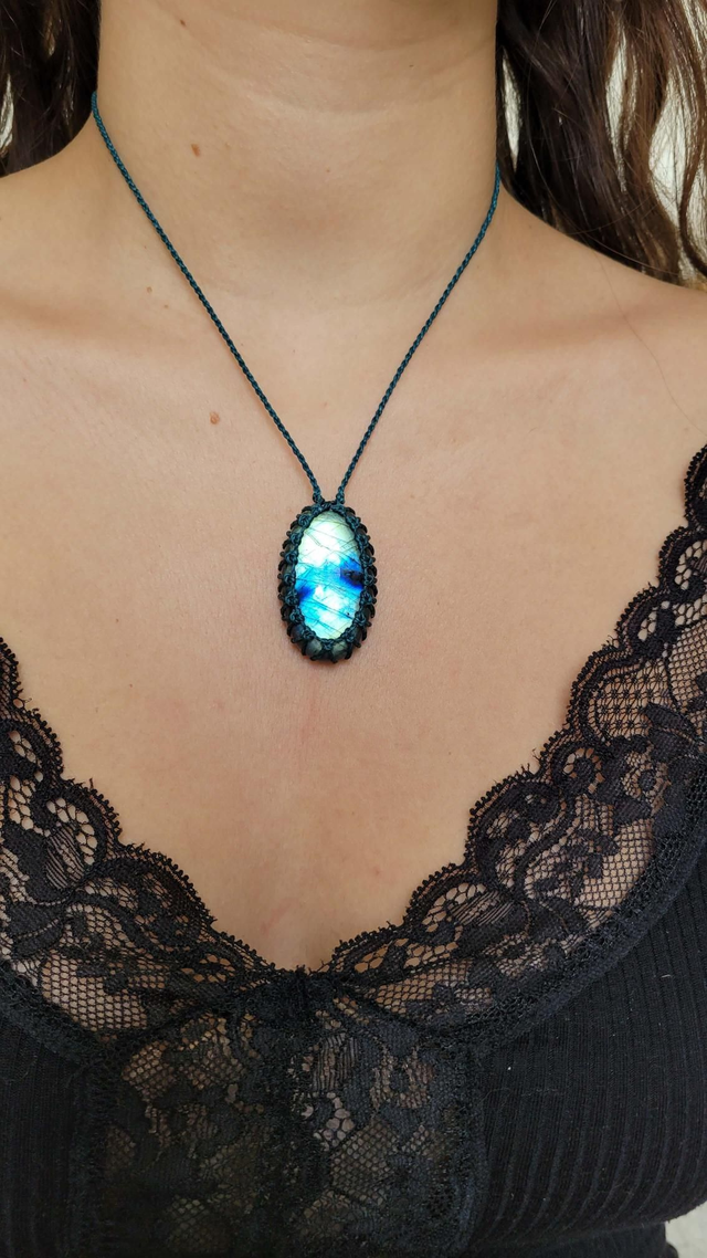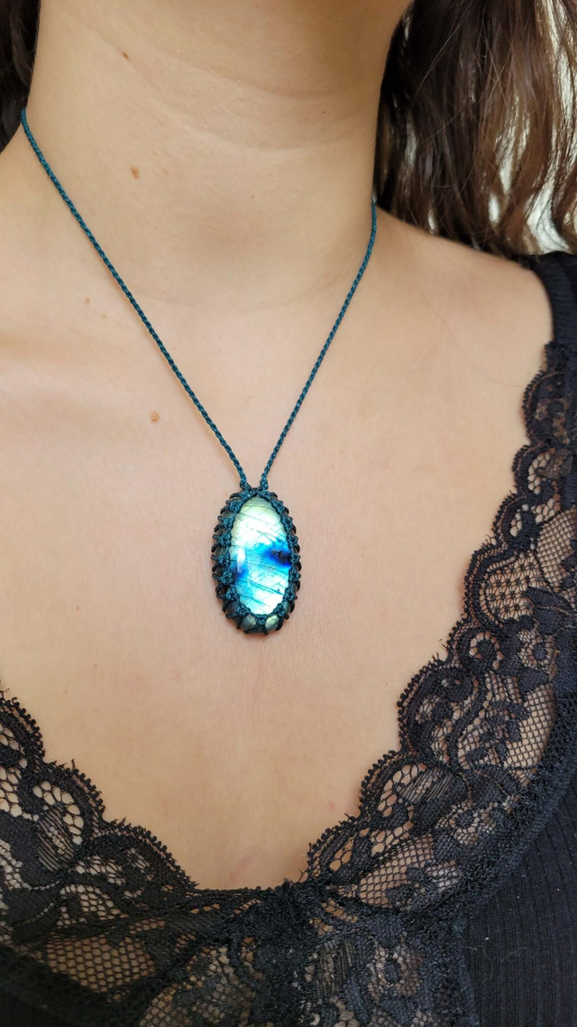 Pendentif Labradorite bleu-vert turquoise macramé vert