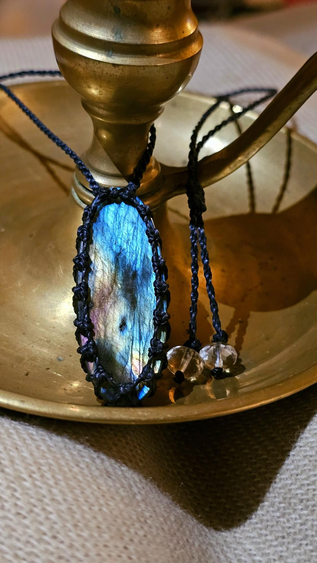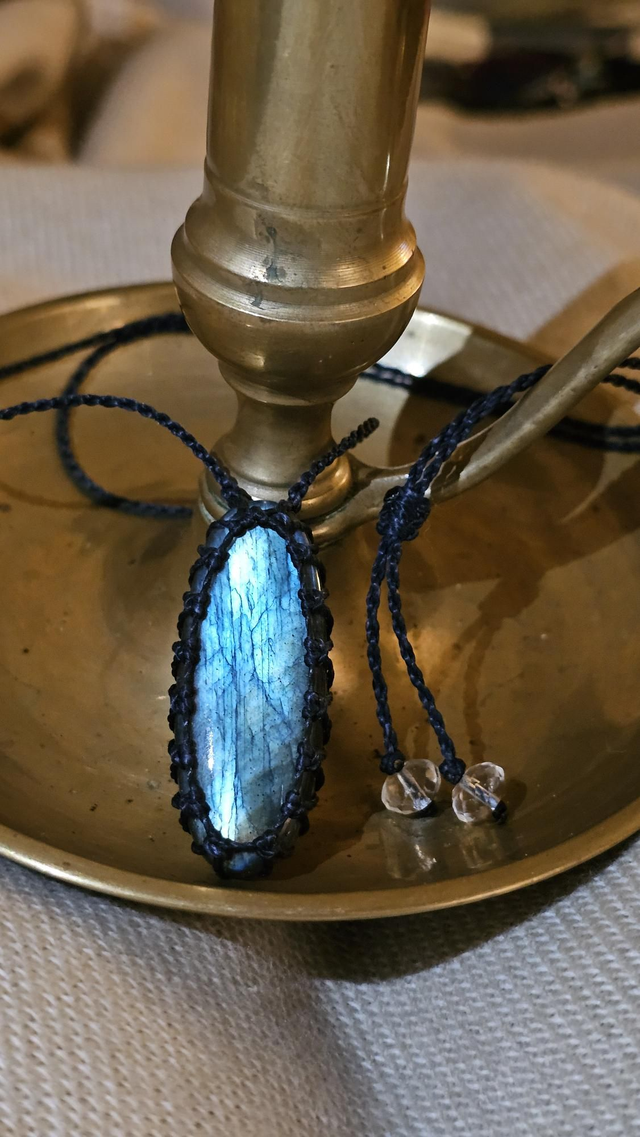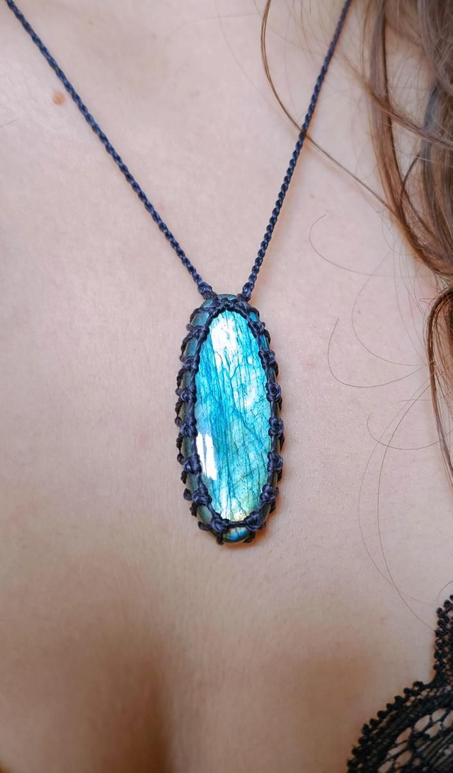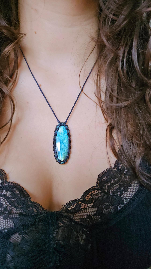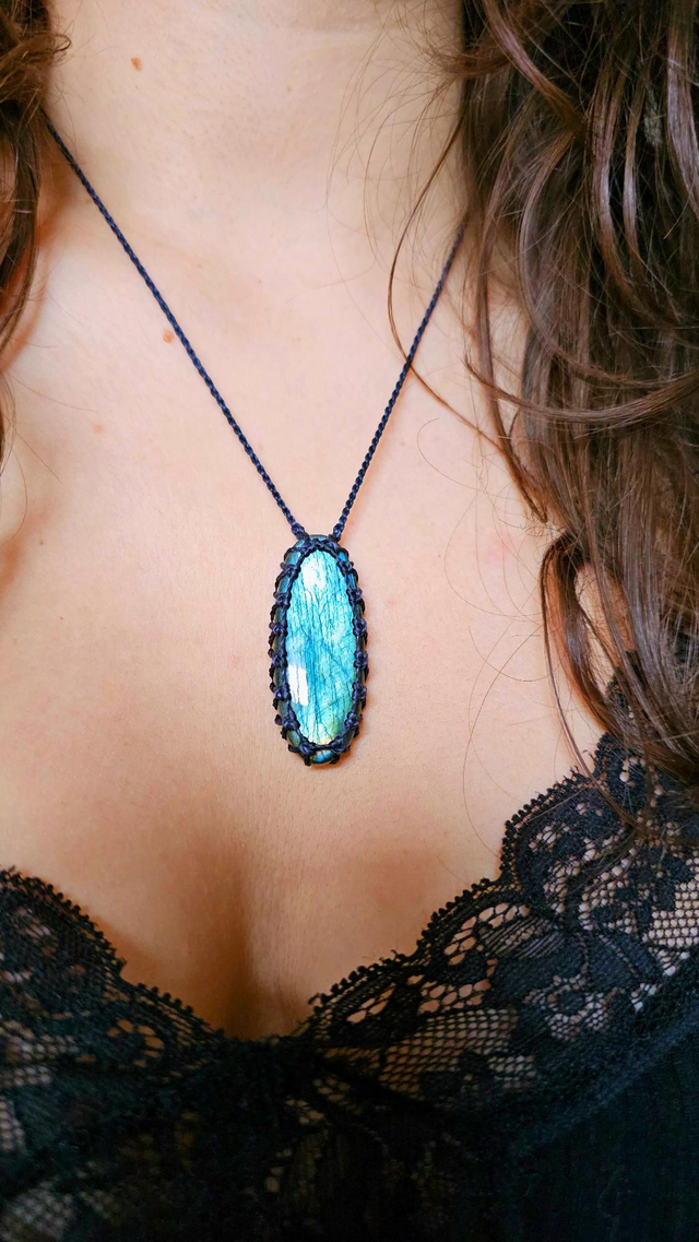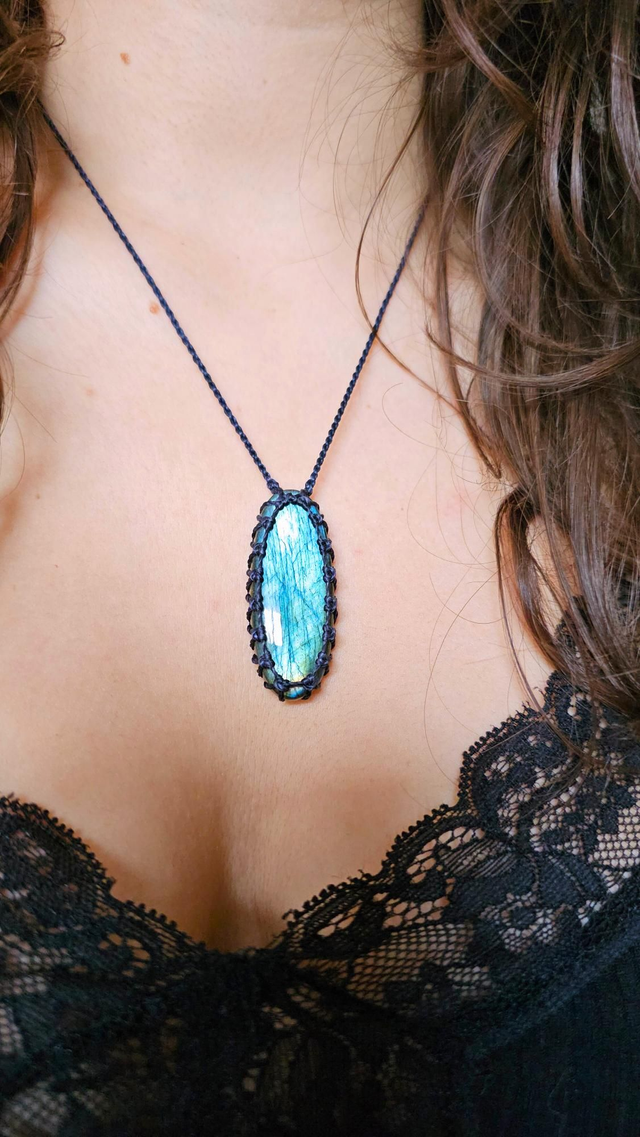 Collier en macramé bleu nuit – pendentif labradorite bleue ovale